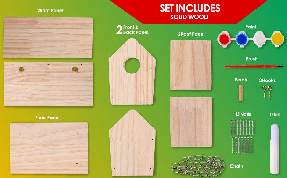 7 wooden birdhouse parts (2 side panels, 2 roof panels,1 floor panel, 1 back panel and 1 front panel), 15 nails, 1 chain, 2 hooks, 1 perch, glue and paint and 1 paintbrush. Also included are easy-to-follow instructions. Each Kit comes with supplies to build 1 birdhouse.